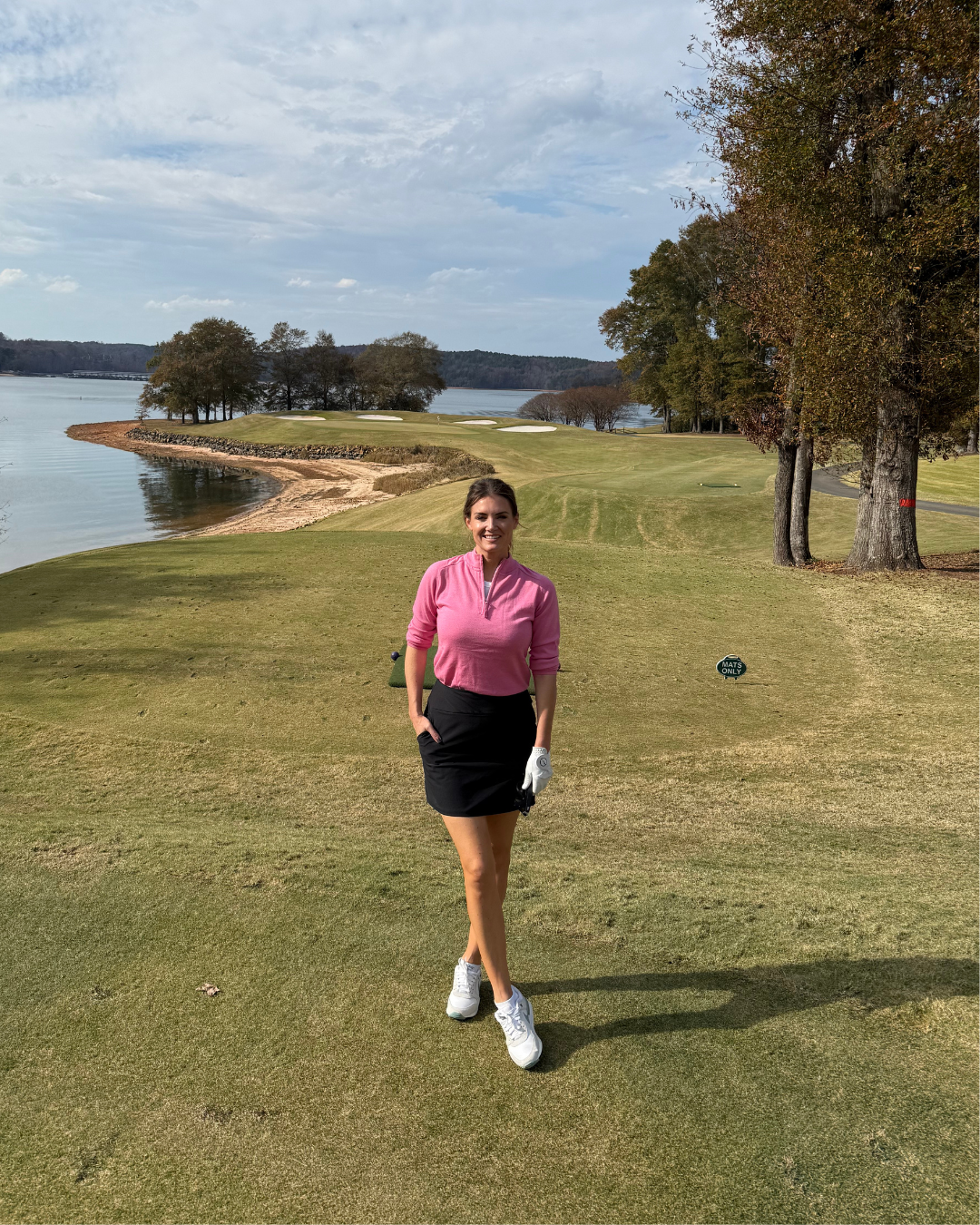 I love a lightweight sweater for cooler tee times, especially one that doesn’t scream “golf attire.” The Le Lis sweater has that effortless “low-key luxury” vibe to it. I can wear it with workout pants or a golf skort/pants. To be transparent, I wore this while golfing at The Walker Course at Clemson University in South Carolina in November, so it was a bit warmer than in the Northeast, but something like this works in both golf climates. I am not typically one for a hot pink anything in golf (I think it is completely played out), but when the trees are bare in the fall and the summer colors aren’t there on the course, I sometimes like to create that pop of color in my wardrobe. These are things that no one besides me probably thinks about (lol), but that’s okay! I paired it with a black skort and Nike golf shoes with a pretty pop of green and didn’t feel like I needed any other accessories since the colors were the standout.