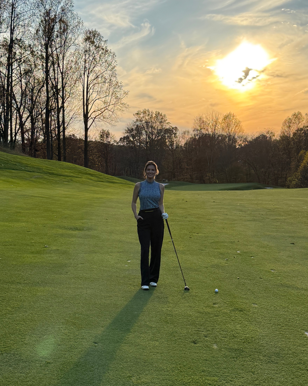 I got this Adidas top on sale at PGA TOUR Superstore this fall. I am not typically one for patterns, but I thought the blue and cream hues were pretty, and I liked the sleeveless mock-neck style for layering. Mock-neck silhouettes are having a moment, and for good reason. They’re flattering, structured, and instantly elevate even the simplest pair of golf pants. This one balances sporty and polished at the same time because of the detail in the pattern and colors. The pants I chose are not specifically for golf. They are these Lululemon athletic trousers which, I will admit, are super nice. These are the definition of versatility. I am not sure if they were intended to be worn on the golf course, but as you’ll learn about me, I am a big fan of piecing together outfits with things you wouldn’t expect. I have been known to wear a skirt over a dress on TV and create a whole new outfit and look with the snap of my fingers. I capped off the look with a VERY old belt that came from a VERY old Calvin Klein work dress I bought many years ago. It is just a black leather belt with a gold bar detail on the front. This belt is NOT meant for golf whatsoever, but I can play in it and like it, so why not?